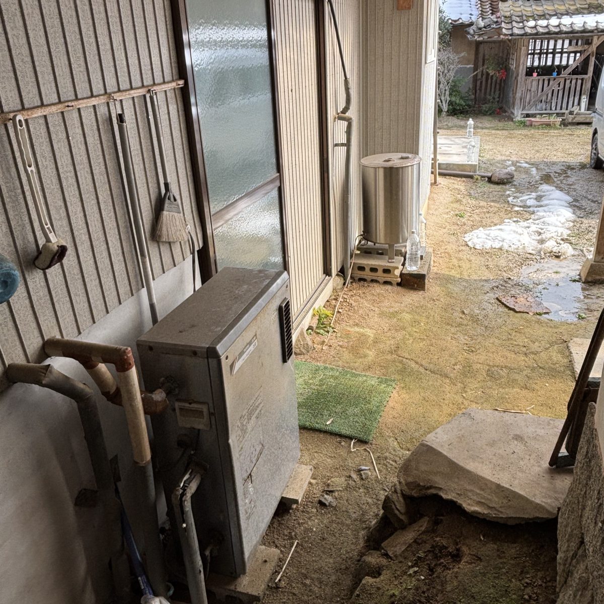 30年近くお使いの給湯器交換工事完了です。雪が多少溶けたものでようやく取替工事が可能となりました。油タンク中身がほぼほぼ